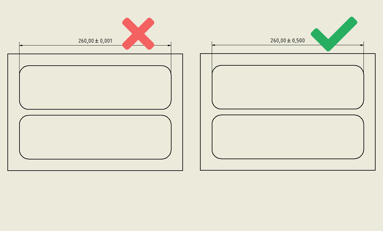 Overvej nøje behovet for tolerancer når du laver dine produktionstegninger. Jo mindre tolerancer, desto længere tid tager det både at producere og kvalitetskontrollerer emnet. Er tolerancerne ikke nødvendige for dit design, vil tolerancerne kun forøge prisen per emne unødvendigt. Overvej derfor om en større tolerance kan accepteres.