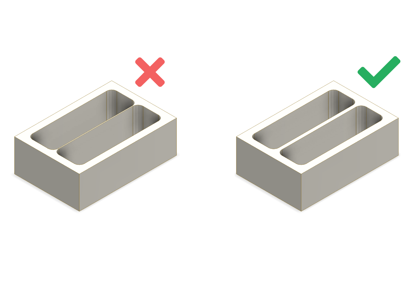Når du designer emner med udskæringer, kan du med fordel forøge hjørneradier og således reducerer kostprisen. Jo større din hjørneradius er, desto større et fræseværktøj kan benyttes, og desto hurtigere kan emnet bearbejdes. Da du betaler for tiden brugt betyder dette billigere emner.